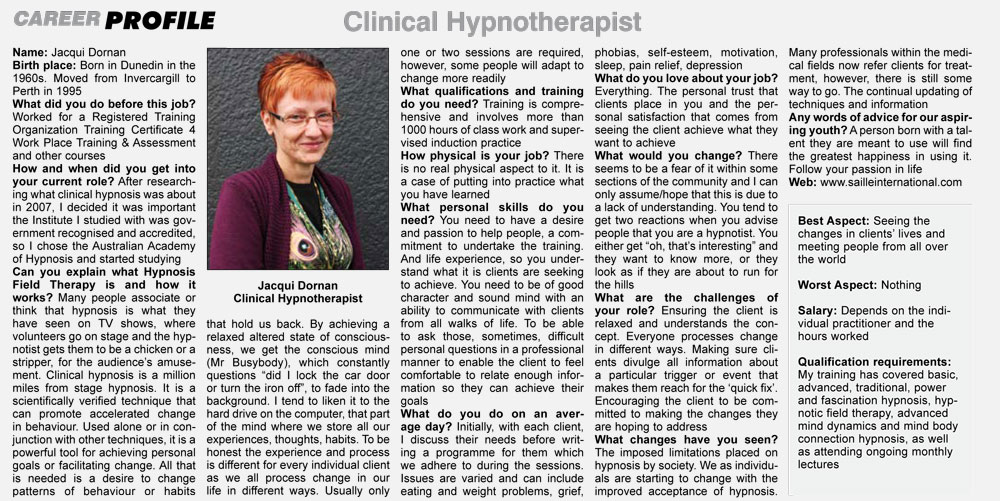 As a naturally caring person Jacqui has helped many people with all types of issues through her unique methods incorporating hypnosis and other healing modalities. Jacqui sees clients from her 2 central Perth clinics as well as by appointment in New Zealand.